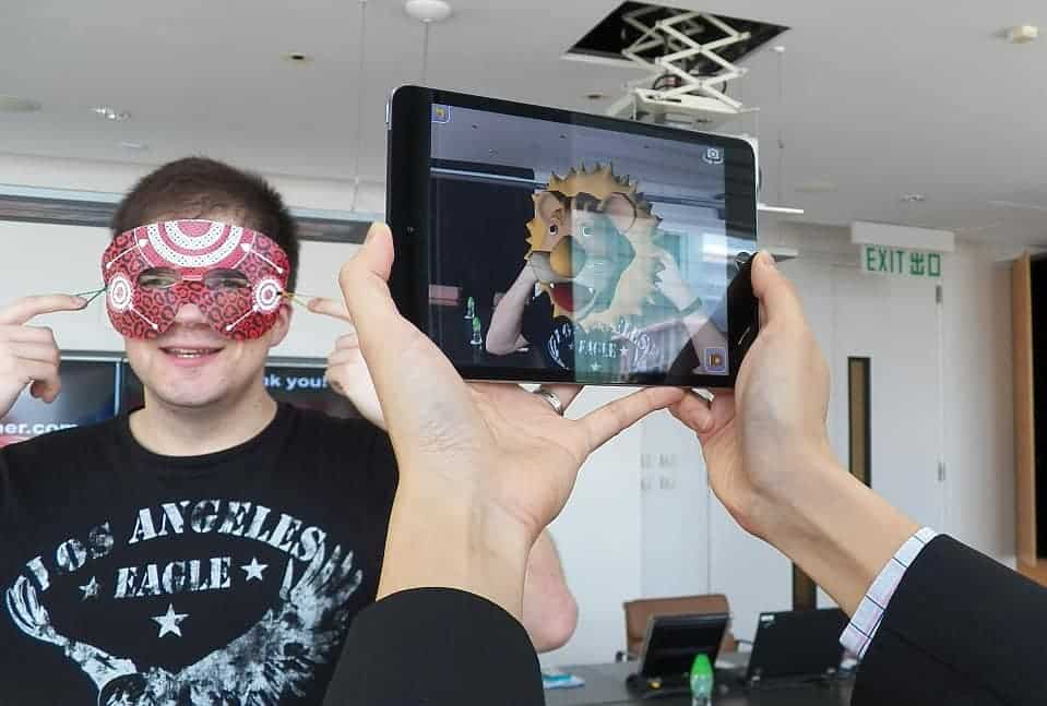 Georg Pichler, one of reporter from Austrian daily Der Standard had invited us to demonstrate how to play with Augmented Reality(AR) technology. He enjoyed much in playing with one of our AR app, in which scanning on the colourful masks he wore can bring with a 3D animal head shown on the mobile screen! A happy photo with animal head on his body could be taken for his instant gift as well. We are so glad to meet such a funny reporter from Austria.